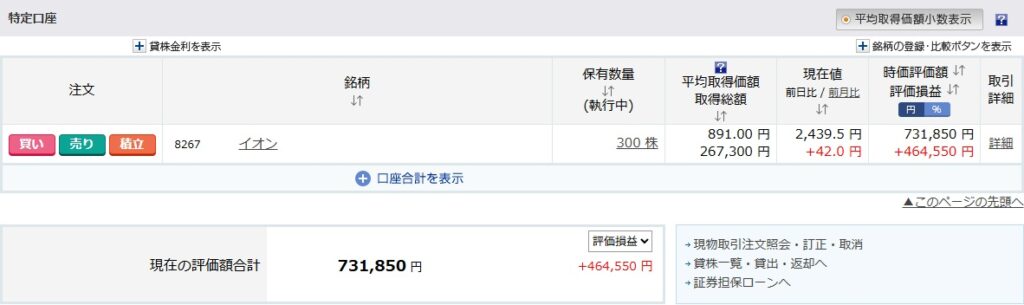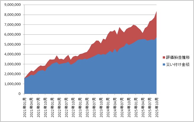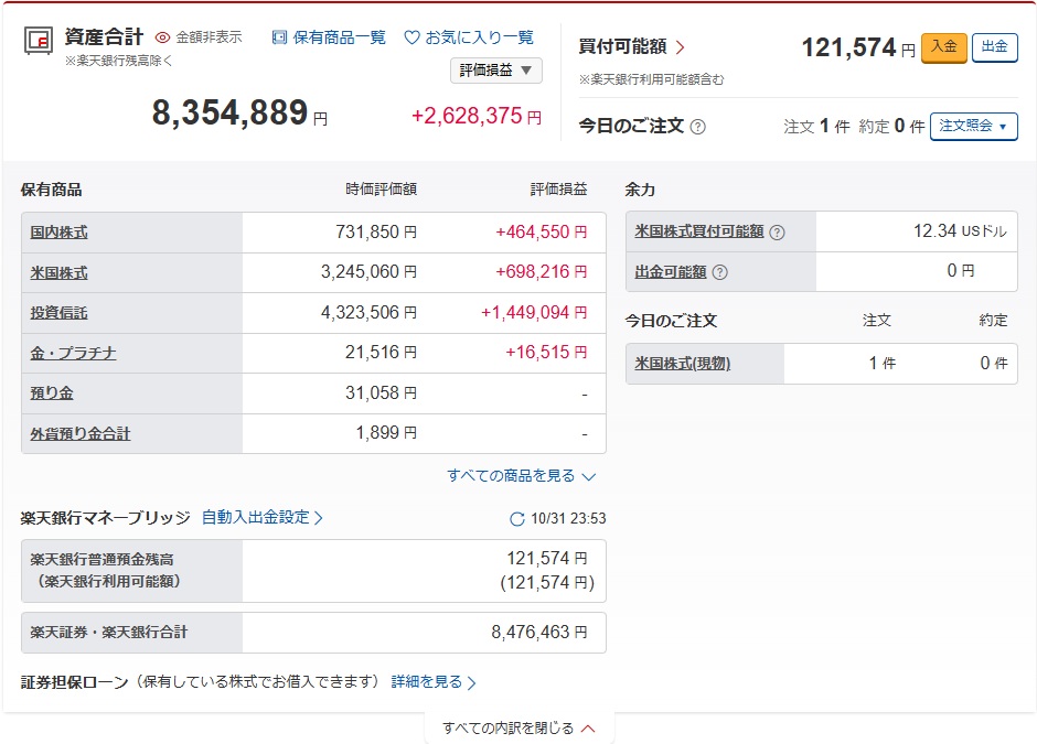 今の資産合計は8,354,889円で評価損益は+2,628,375円です。