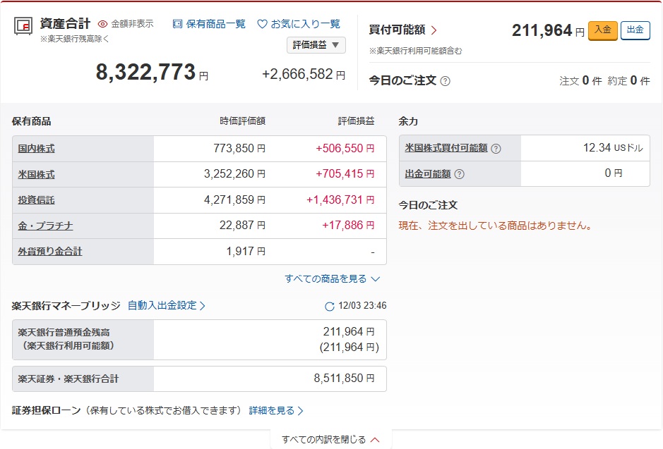 今の資産合計は8,322,773円で評価損益は+2,666,582円です。