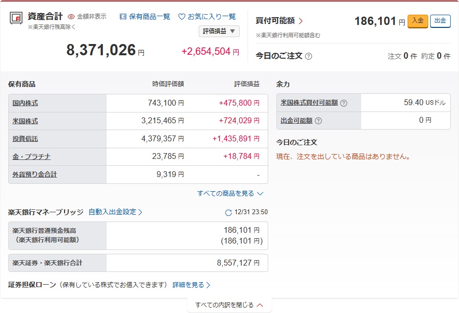 今の資産合計は8,371,026円で評価損益は+2,654,504円です。
