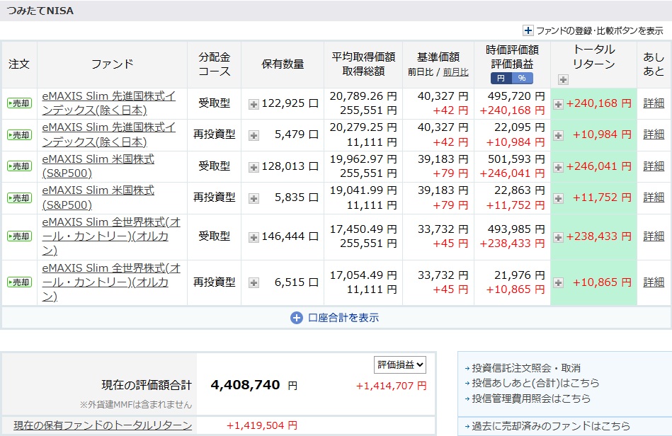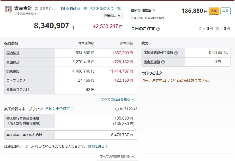 今の資産合計は8,340,907円で評価損益は+2,533,247円です。