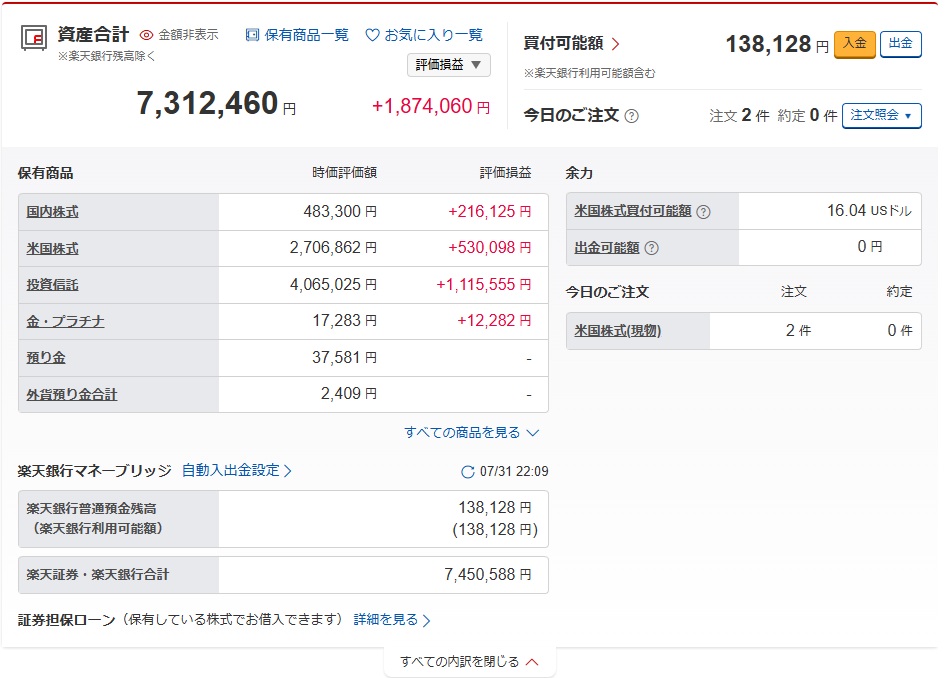 今の資産合計は7,312,460円で評価損益は+1,874,060円です。